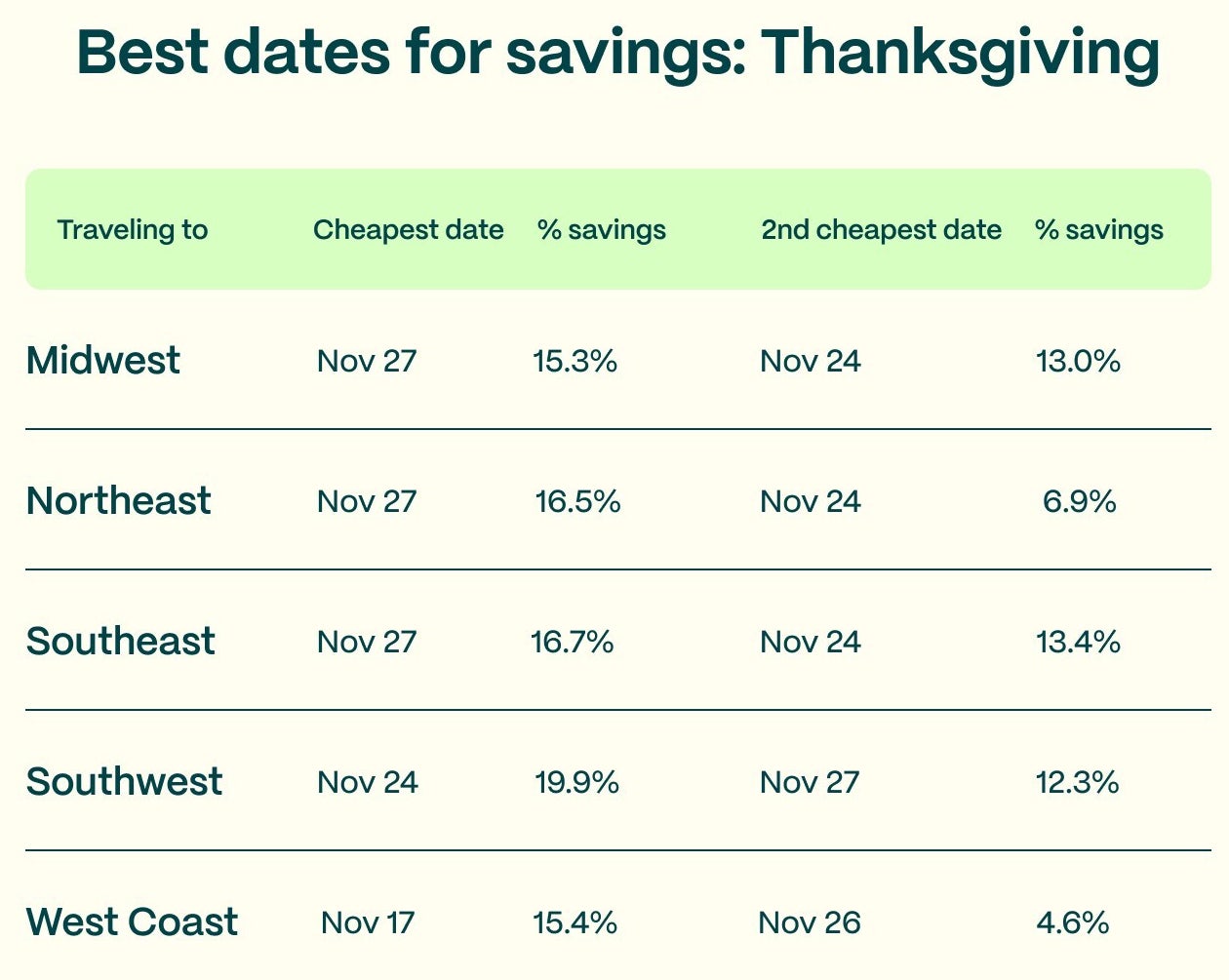 For Thanksgiving (November 27), the cheapest date for flights to the Midwest, including Illinois and Ohio, is on the 27th, with savings of 15.3 percent. The second-cheapest date for that region is November 24, with savings of 13 percent.