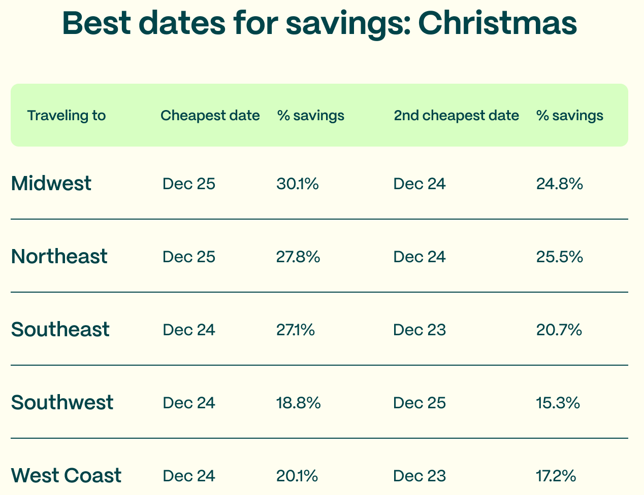 December 24 is the cheapest day to fly to the Southeast (27.1 percent cheaper), Southwest (18.8 percent) and West Coast (20.1 percent), while the second-cheapest day for the Southeast is December 23 (20.7 percent); for the Southwest it's December 25 (15.3 percent) and for the West Coast it's December 23 (17.2 percent).