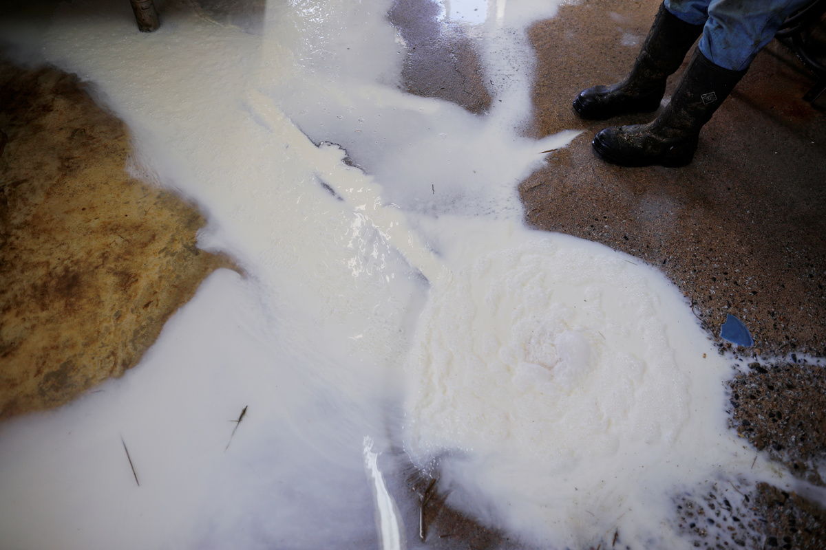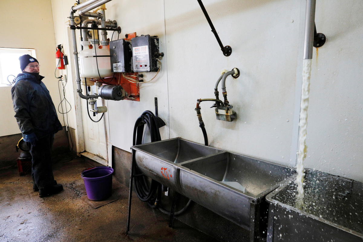 Dairy farmer Fred Stone watches the milk collected the previous day go down the floor drain, after discovering the soil, hay, and the milk from the cows on the farm contain extremely high levels of PFAS chemicals resulting from a 1980's state program to fertilize the pastures with treated sludge waste and making the milk unsuitable for sale, at the Stoneridge Farm in Arundel, Maine, U.S., March 11, 2019. Picture taken March 11, 2019. REUTERS/Brian Snyder