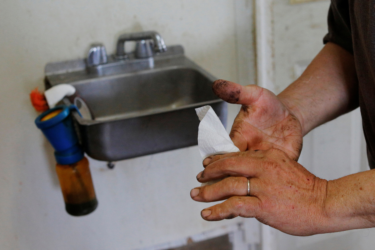 Fred Stone washes his hands while working on his dairy farm, after discovering the soil, hay, and the milk from the cows contain extremely high levels of PFAS chemicals resulting from a 1980's state program to fertilize the pastures with treated sludge waste and making the milk unsuitable for sale, at the Stoneridge Farm in Arundel, Maine, U.S., March 11, 2019. Picture taken March 11, 2019. REUTERS/Brian Snyder