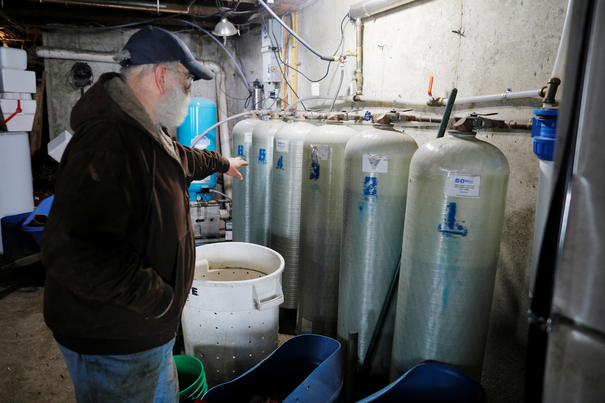 Dairy farmer Fred Stone points to the water filtration system he installed after discovering the soil, hay, and the milk from the cows contain extremely high levels of PFAS chemicals resulting from a 1980's state program to fertilize the pastures with treated sludge waste and making the milk unsuitable for sale, at the Stoneridge Farm in Arundel, Maine, U.S., March 11, 2019. Picture taken March 11, 2019. REUTERS/Brian Snyder