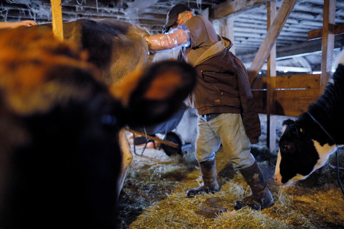 Dairy farmer Fred Stone prepares to breed a cow for a neighbor, after discovering the soil, hay, and the milk from the cows on his farm contain extremely high levels of PFAS chemicals resulting from a 1980's state program to fertilize the pastures with treated sludge waste and making the milk unsuitable for sale, in Arundel, Maine, U.S., March 11, 2019. Picture taken March 11, 2019. REUTERS/Brian Snyder