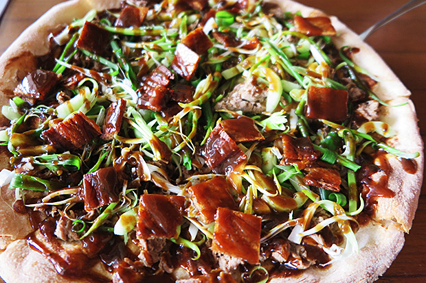 Pizzas hot from the visibly blazing oven include Thai pad kapao gai (380) topping but the biggest seller is self-explanatory yet revelatory Peking Duck pizza (590) over thin, biscuit-crisp dough.