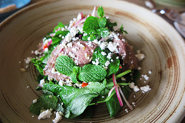 Mediterranean-style seared sliced lamb rump salad (490) with fresh mint and spinach, red onion and chilli, goes hyper gourmet with a punch of red wine vinegar, salty drizzle of anchovy oil, and luscious sprinkle of crumbled feta cheese – no trouble for those averse to lamb's alleged odour! Ditto lamb shoulder (900) slow-cooked on the bone with oil-enhancing lemon, rosemary and garlic, served with juices-immersed crushed new potatoes.