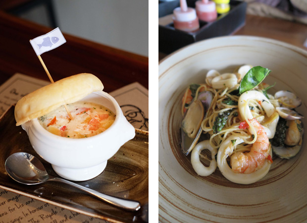 The juices and aromas of poached salmon and smoked haddock chowder (380) with ham, leak, potato and tomato are sealed with shortcrust pastry you crack into the broth for a cockles of the heart-warming meal in one.
