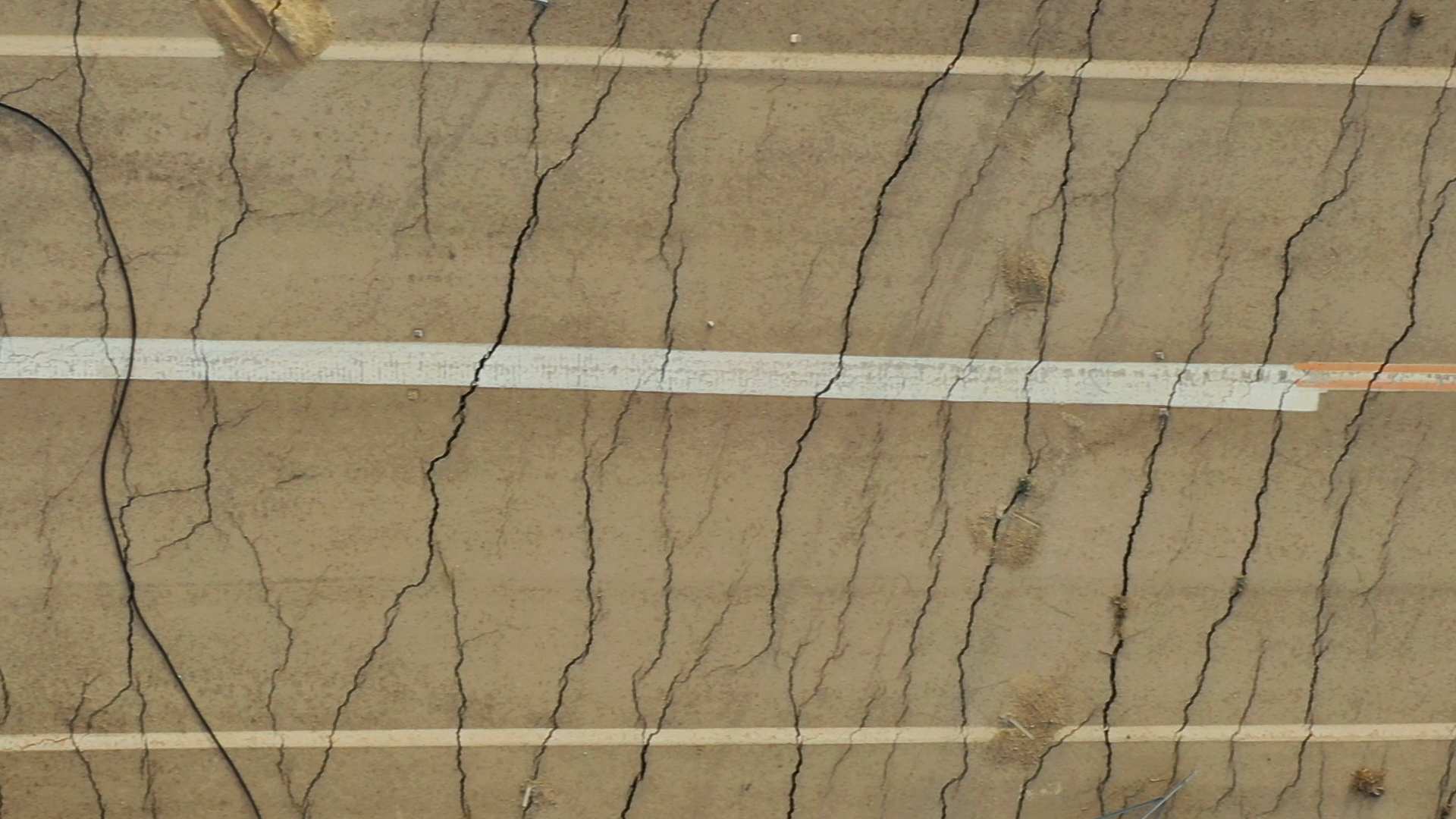 This narrow crack in the highway will one day collapse into a gaping sinkhole, but for now the surface is holding beneath our feet.
