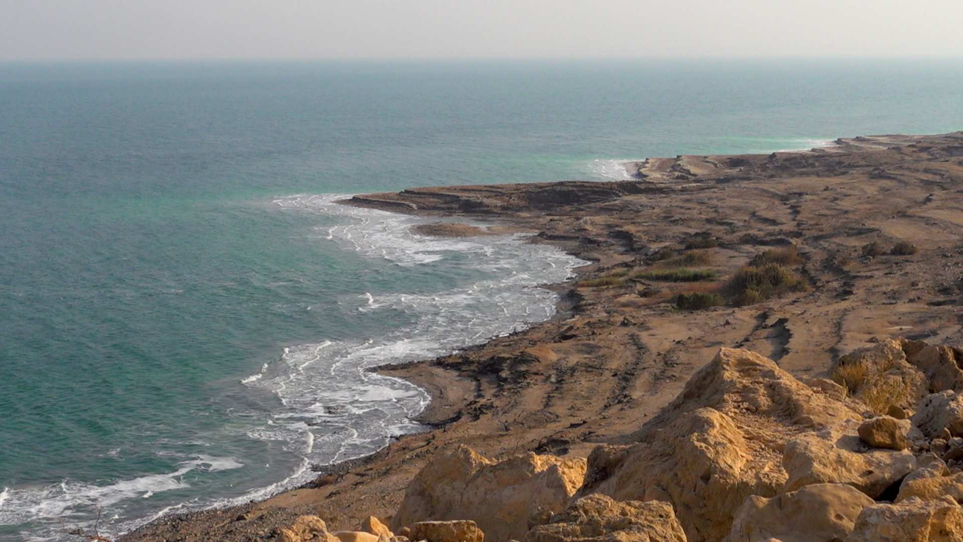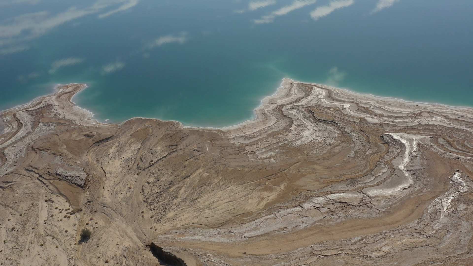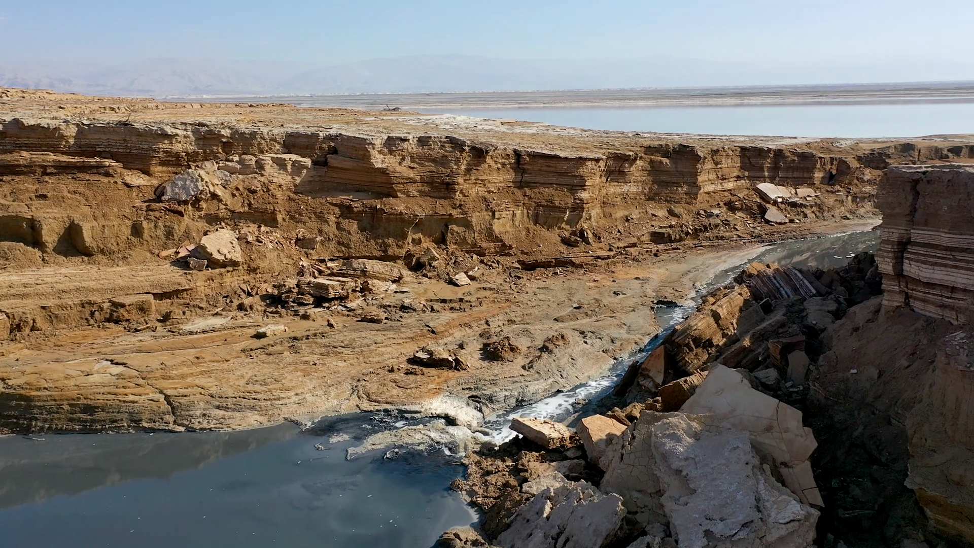 As the Dead Sea's water level drops, sections of previously inundated land become exposed above the waterline.