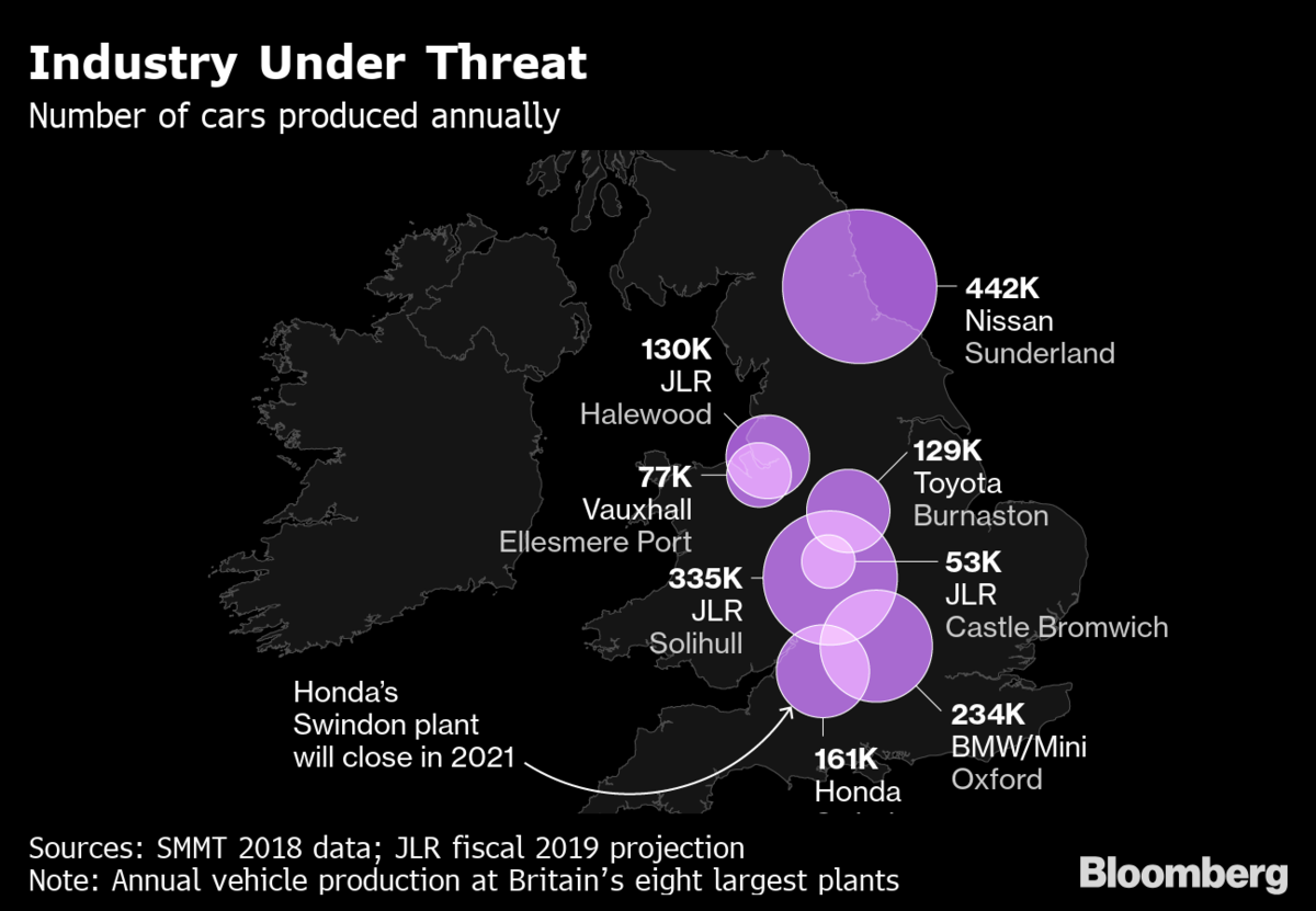 There’s been a wave of bad news for the auto industry. Jaguar Land Rover, Britain’s biggest automaker, is scrapping jobs worldwide, many of them in the U.K., and there are questions about the future of facilities run by Ford and Peugeot. Just this month, Nissan scrapped plans to build the X-Trail sport-utility vehicle at a plant in Sunderland due to a slump in demand for diesel cars and the unresolved status of U.K. trade after Brexit.