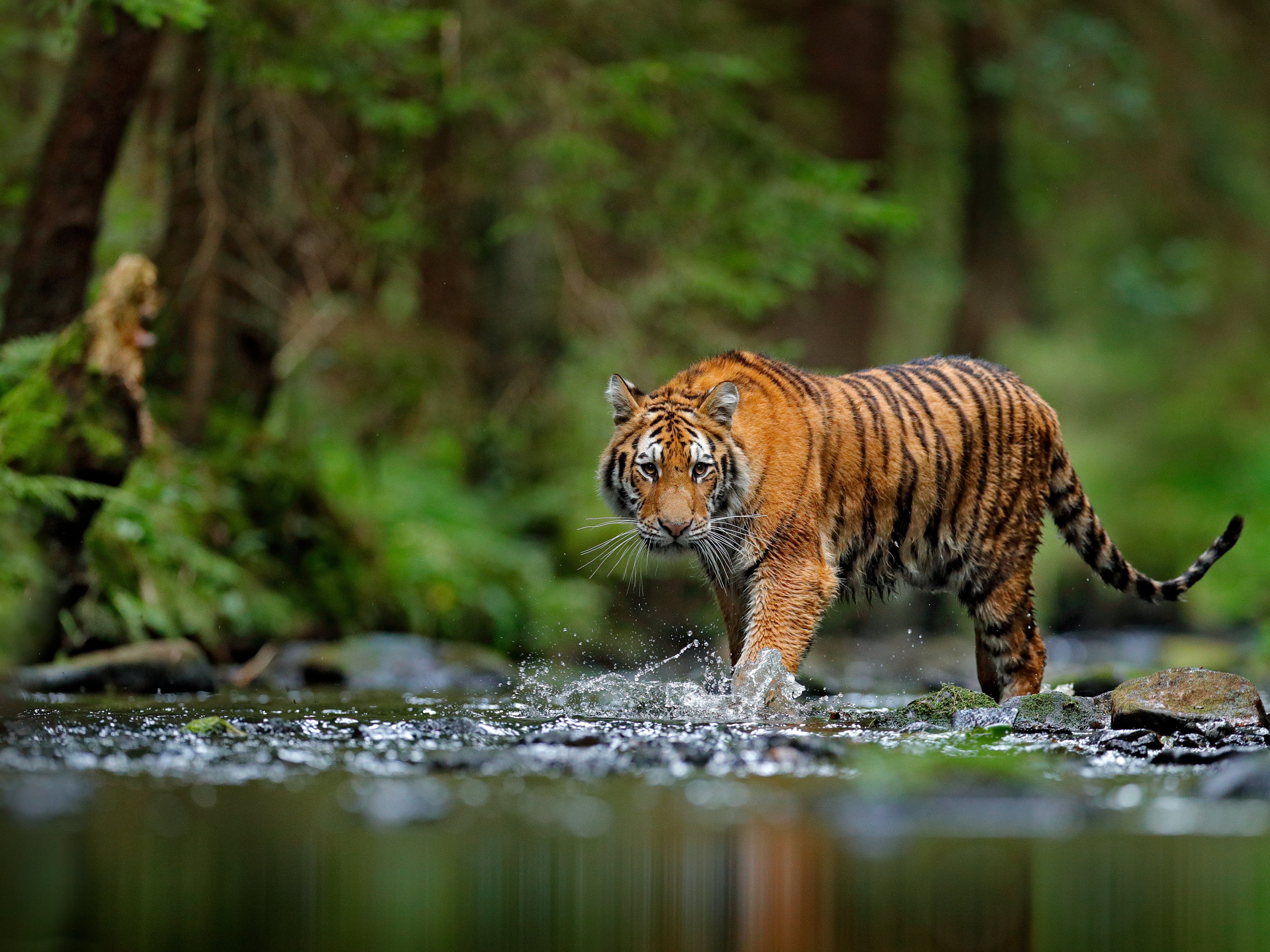 Amur tiger walking in the water. Dangerous animal, taiga, Russia. Animal in green forest stream. Grey stone, river droplet. Wild cat in nature habitat.