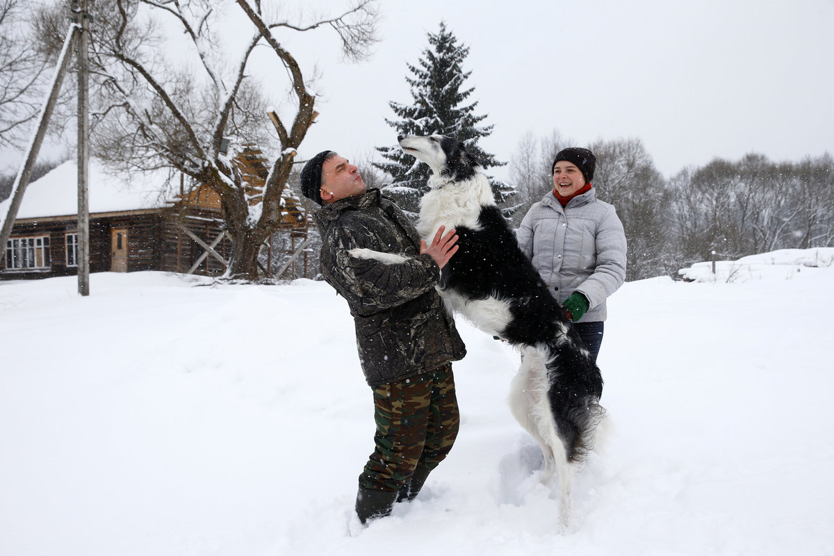 Dmitry Shamovich and his wife Anastasia Kuzmenkova play with the dog Amur at their homestead Zaimka Leshego in the village of Sosnovy Bor, Belarus, February 7, 2018. REUTERS/Vasily Fedosenko