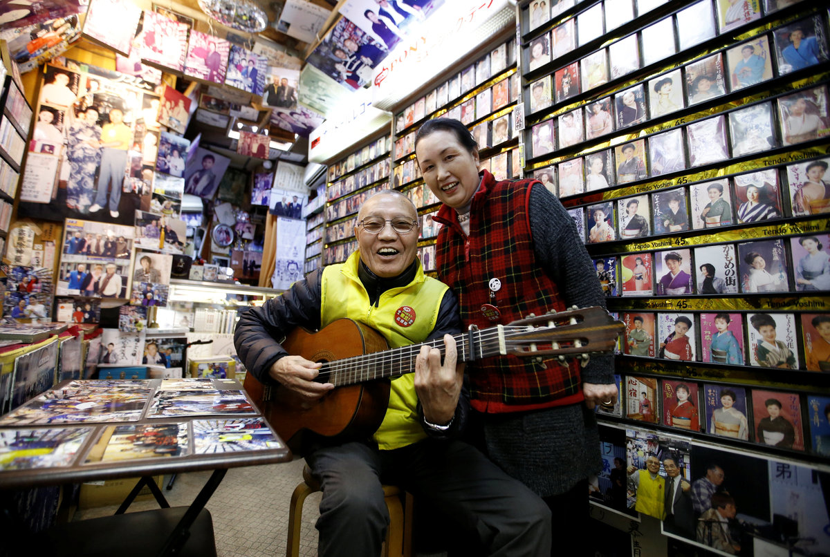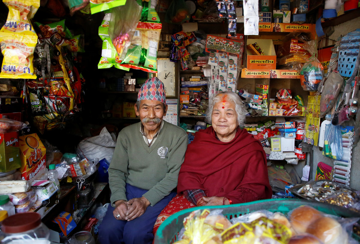 Nhuchhe Bahadur Amatya, 76, a retired accountant at Nepal Electricity Authority along with his wife Raywoti Devi Amatya, 74, a housewife, pose for a picture as they sit inside their shop in Lalitpur, Nepal, February 4, 2018. REUTERS/Navesh Chitrakar