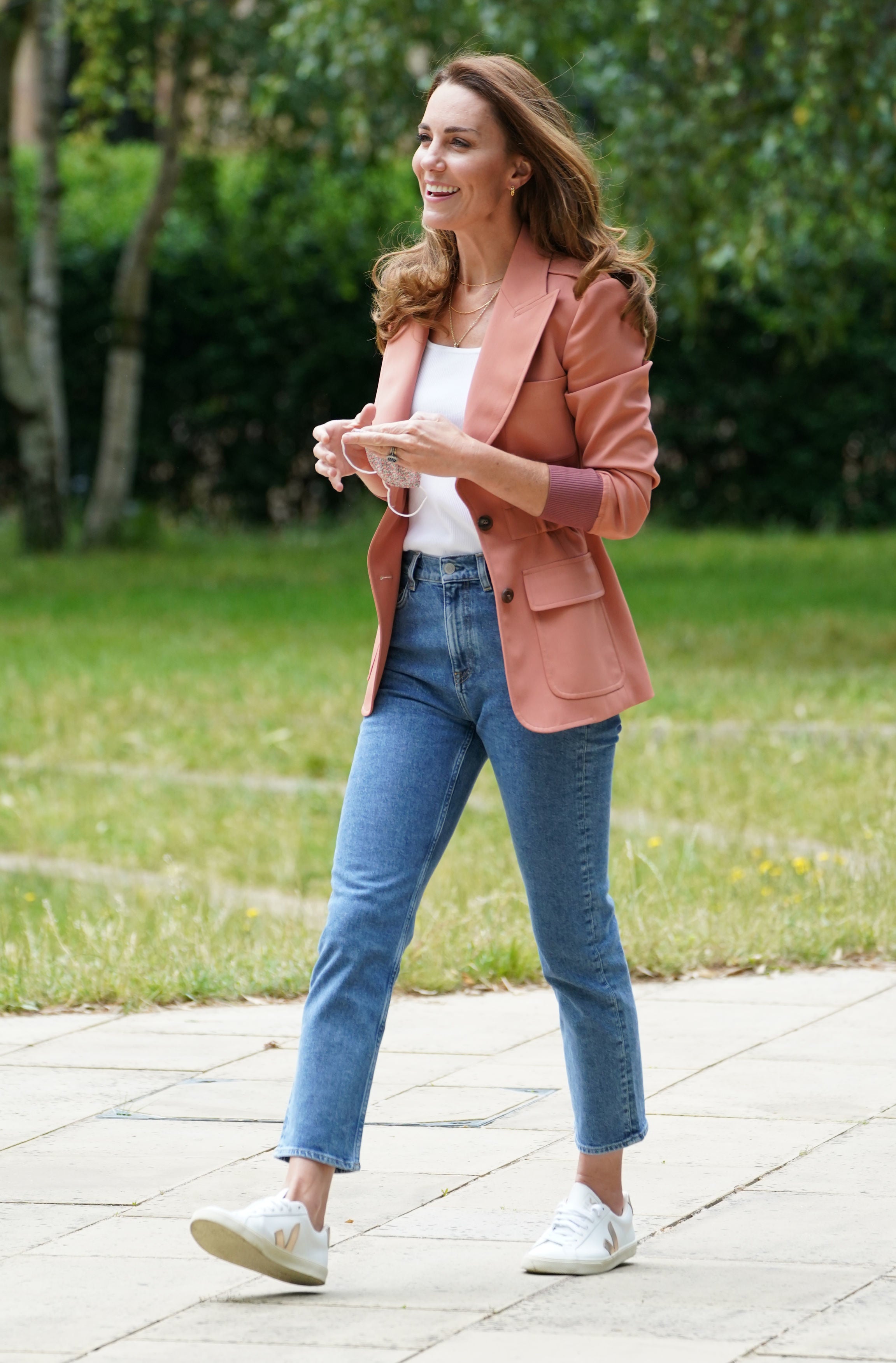 Kate knows the power of styling: this forest green jacket from Massimo Dutti is a staunch favourite, but it could look extremely formal with straight leg trousers – except she paired it with white Superga trainers and a relaxed polka dot shirt underneath, making the whole look feel much more chilled.