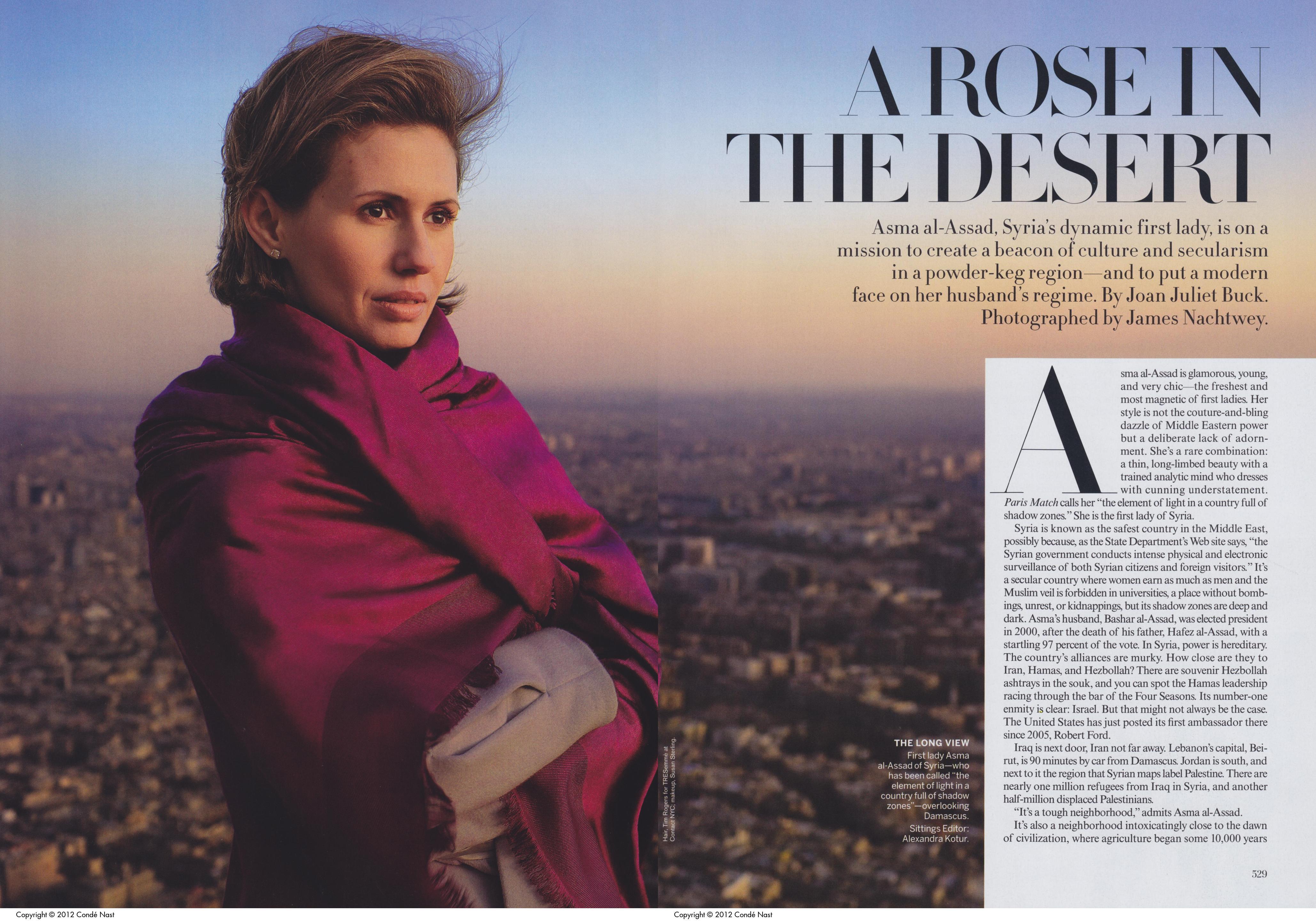In its March 2011 'Power' issue, American Vogue published a fawning profile of Asma al-Assad, describing her as "glamorous, young, and very chic".