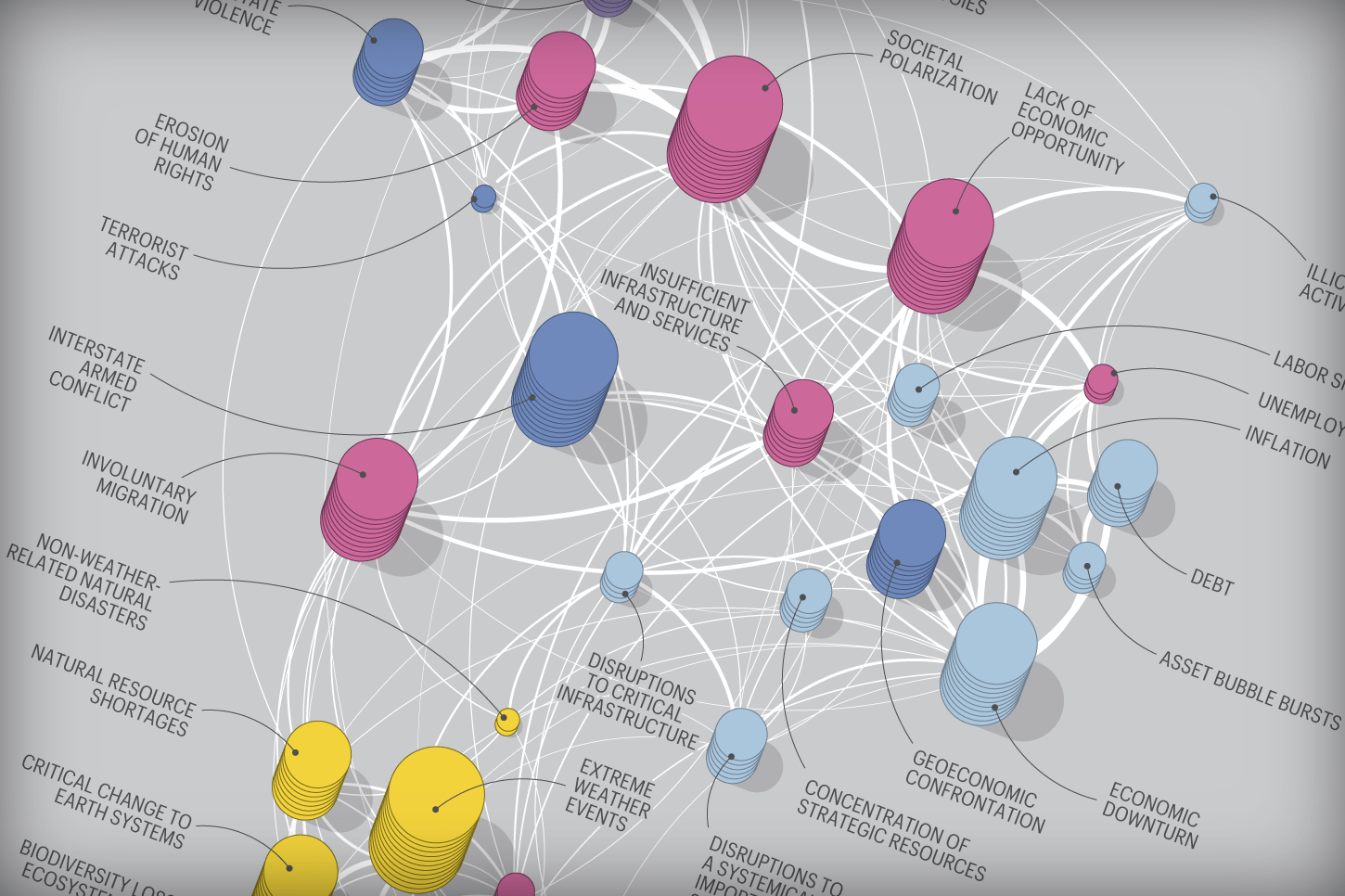 That’s why the World Economic Forum gets granular in its risk survey, asking business and government leaders about a more detailed range of threats—and analyzing how those threats influence one another. Notice the lines in this risk map that connect, say, inflation to unemployment, or extreme weather to supply-chain disruptions. Leaders who understand how these crises are interrelated, the thinking goes, are better prepared to survive any and all of them.