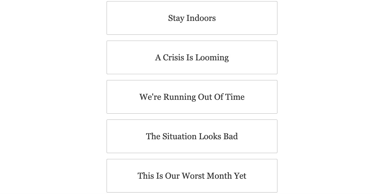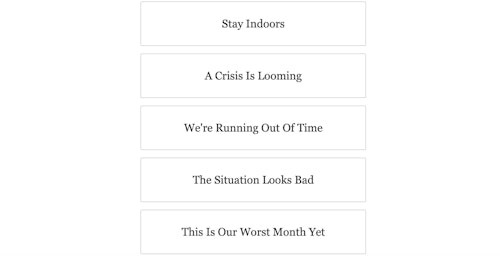 The Endless Doomscroller took Grosser a couple of weeks to complete. On the website, he describes it as “an opportunity for mindfulness about how we’re spending our time online and about who most benefits from our late night scroll sessions.” Pulling primarily from the Washington Post, New York Times, and articles posted to the coronavirus and politics subreddits, it cuts out any context, leaving behind only short, ominous warnings: “Solution Elusive,” “Global Crisis Continues,” “It’s Not Safe.” You can swipe forever but you can’t click through to anything. There are no images, metrics, or comments. Just bad headline after bad headline. And yet, somehow, unlike the guaranteed bad mood caused by regular doomscrolling, I find it soothing.
