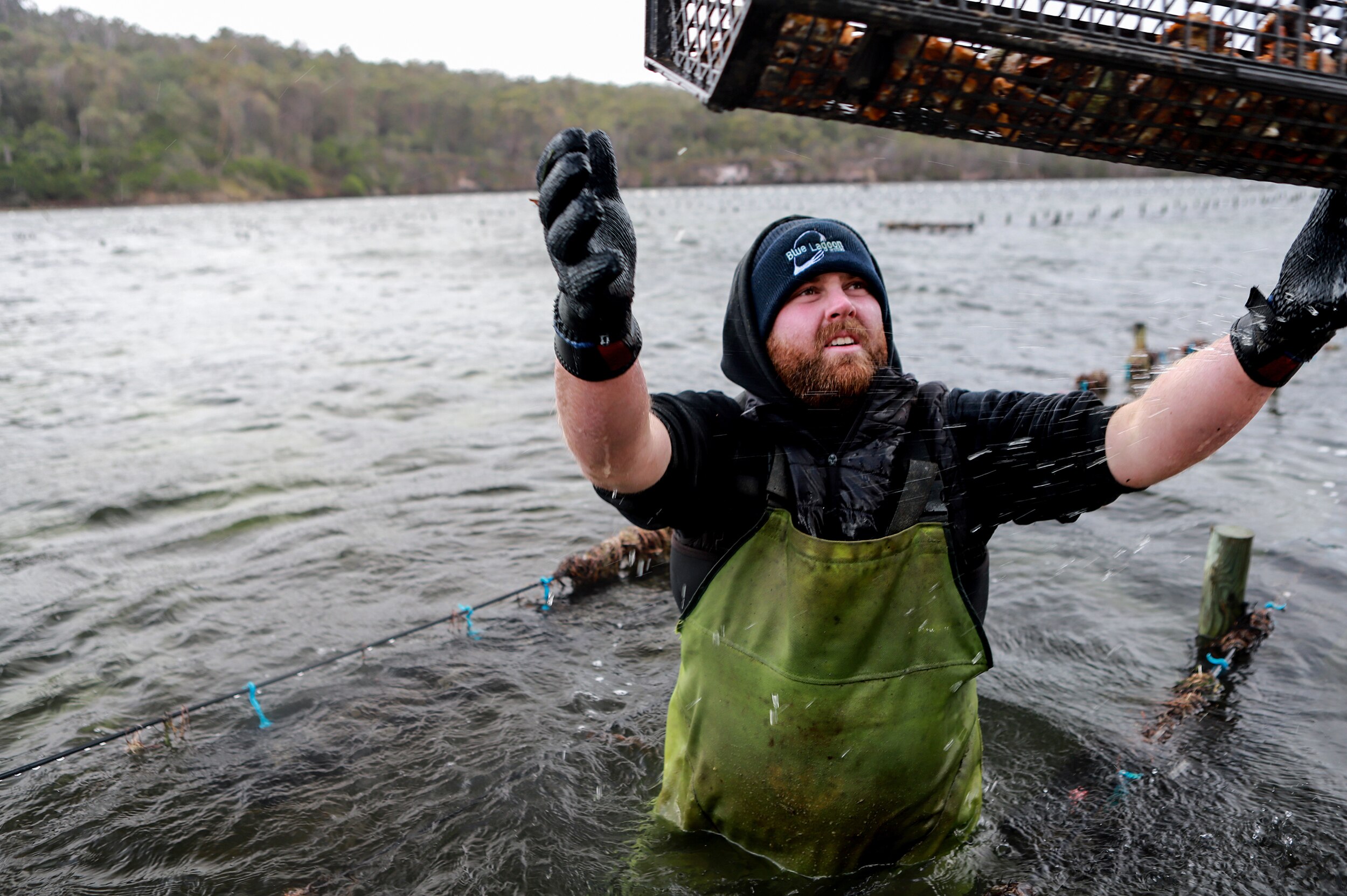 With the right sort of telescope set up at the goat farm, you could just about see Phil Glover and his small team hauling out oyster baskets from the bay.