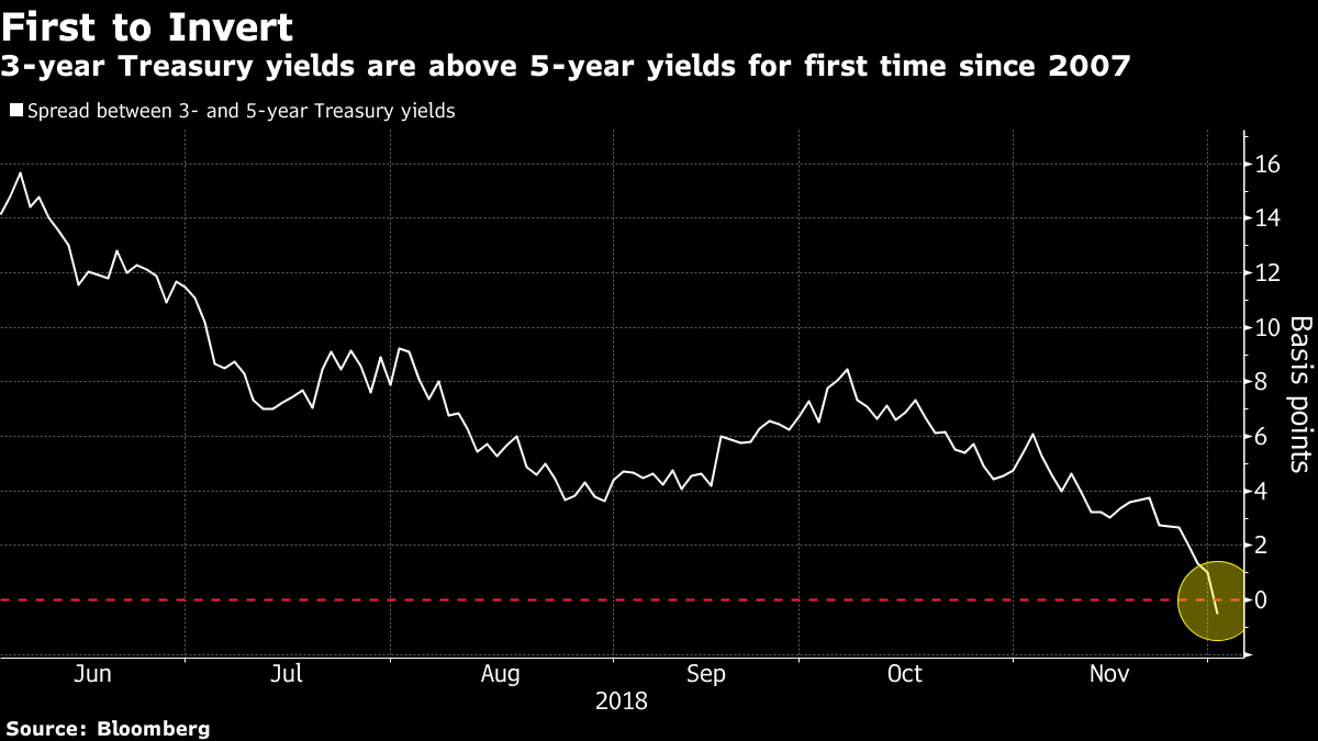 Curve flattening over the past two years has signaled investors’ concern that rising rates against a backdrop of slowing global growth could harm the U.S. economy. Inversion -- where yields at the short end rise above those at the long end -- has been a reliable indicator of recessions.