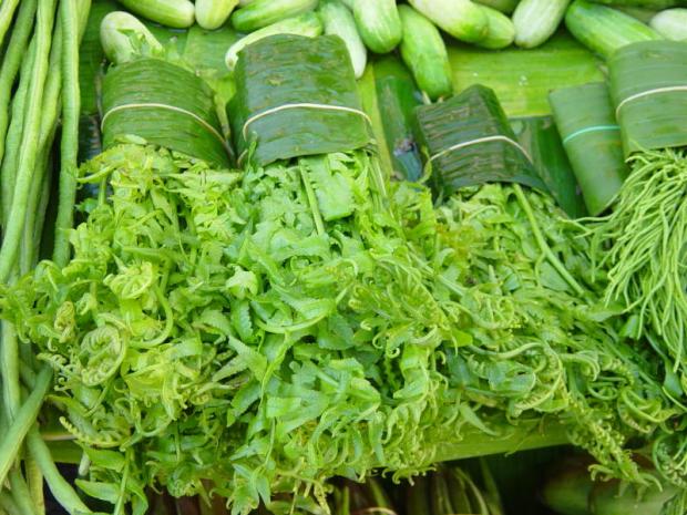At markets, vegetables are placed above banana leaves because they can help retain the freshness.