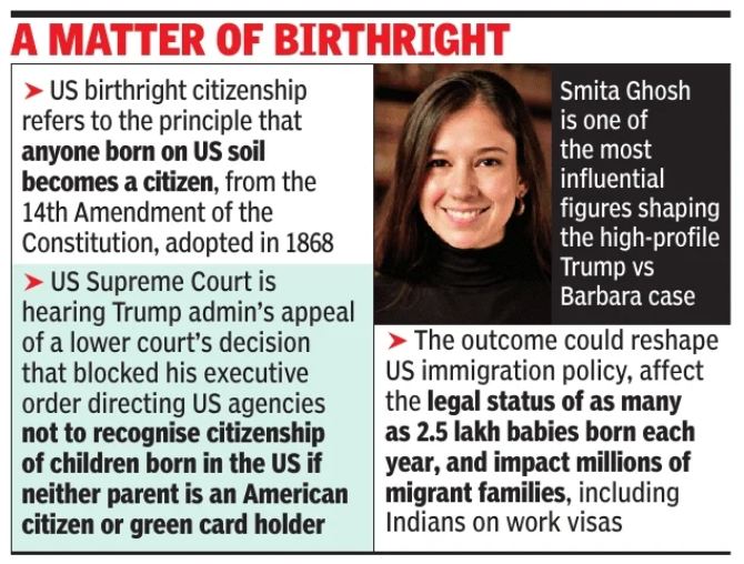 TOI correspondent from Washington: As the US Supreme Court prepares to hear arguments on Wednesday morning in the closely watched birthright citizenship case Trump v. Barbara, one of the most influential figures shaping the legal battlefield is also among its least publicly known or understood: Indian-American attorney Smita Ghosh, Senior Appellate Counsel at the Constitutional Accountability Center.