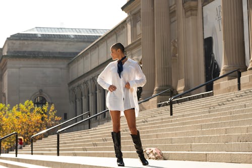 It wouldn't be Gossip Girl if there wasn't an "it" girl, and the wealthy fashion influencer Julien Calloway is her this season. Daman says she shows off a new style of gender-neutral uniforms made up of equal parts men's button-ups and Saint Laurent varsity jackets with leather knee high boots that look like they cost more than most tuitions. When she's not going over the rules of joining her cool kids clique, she's showing viewers that the uniform of the fashionistas on Gossip Girl is one not confined to gender constructs.