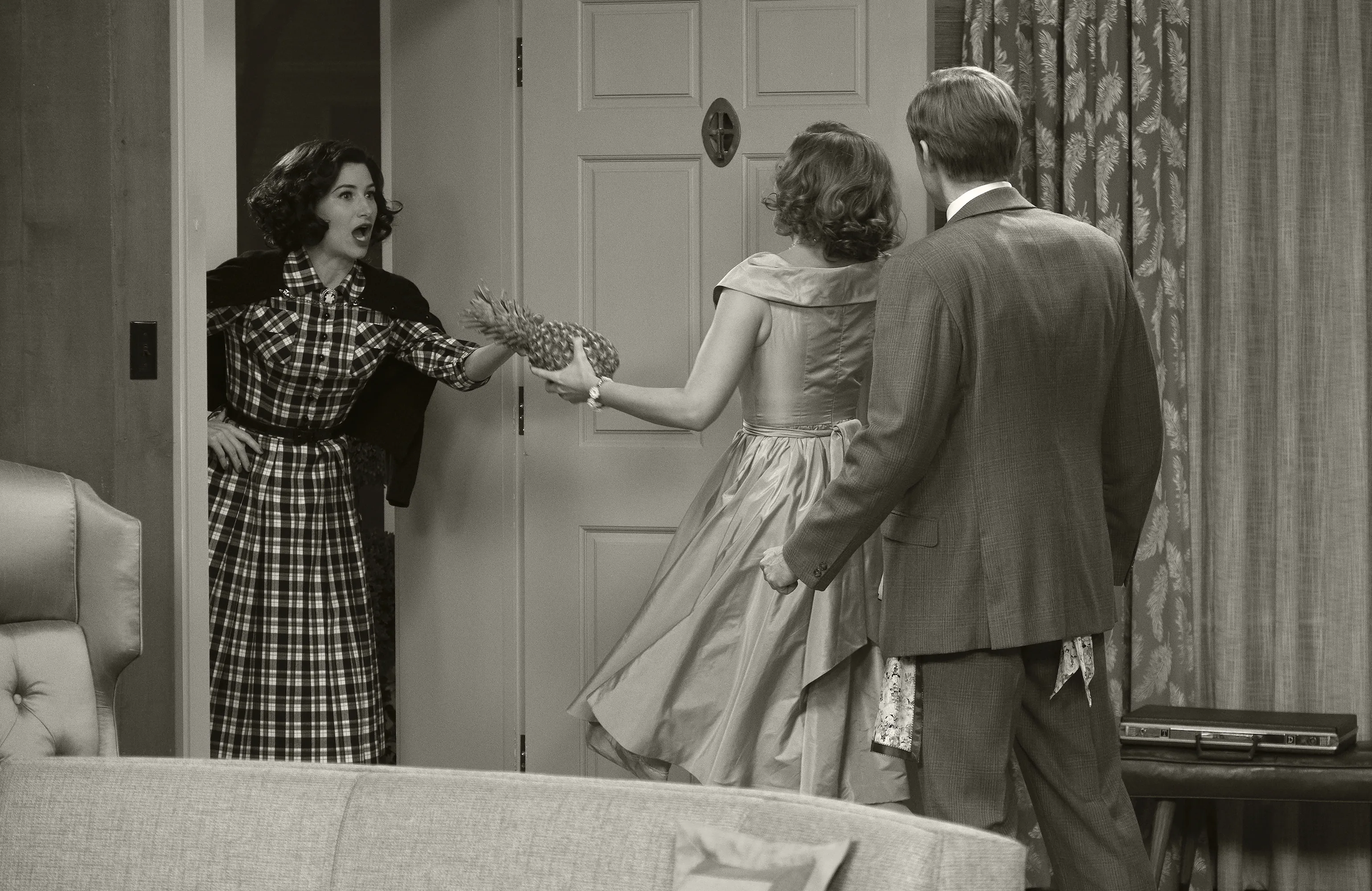 Enter from stage left: Kathryn Hahn as “Agnes,” dressed in plaid and a Mary Tyler Moore-style bob. With flowers in hand, she apologizes for not welcoming the newly married couple, Wanda (Elizabeth Olsen) and Vision (Paul Bettany) to the neighborhood sooner. “My mother-in-law was in town, so I wasn’t,” she says, with sharp timing that cues laughter from the studio audience. (You never meet her husband, by the way.) The spark she brings to the screen upon entering the scene elevates it exponentially, taking homage and turning it into alchemy.
