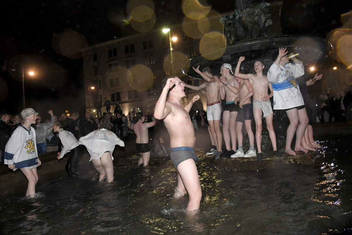 Crowds chanted "Groke! Groke!" in the streets through the night. Police said some 10,000 ice hockey fans gathered on a square in central Helsinki to celebrate, some of them splashing half-naked into a fountain in the cold Finnish spring weather of 7 degrees Celcius (45F). By Monday morning, Helsinki's flagship department store Stockmann had sold out of Groke mugs.