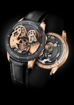 The commemorative timepiece uniquely combines a tourbillion with a long detent escapement and a cable-type fusee transmission system for absolute precision.