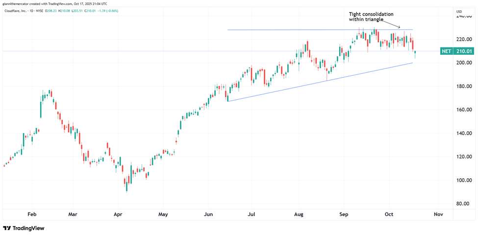 - At a technical level, NET is consolidating tightly within an ascending triangle formation. These patterns point to a continuation in the trend, which is up.