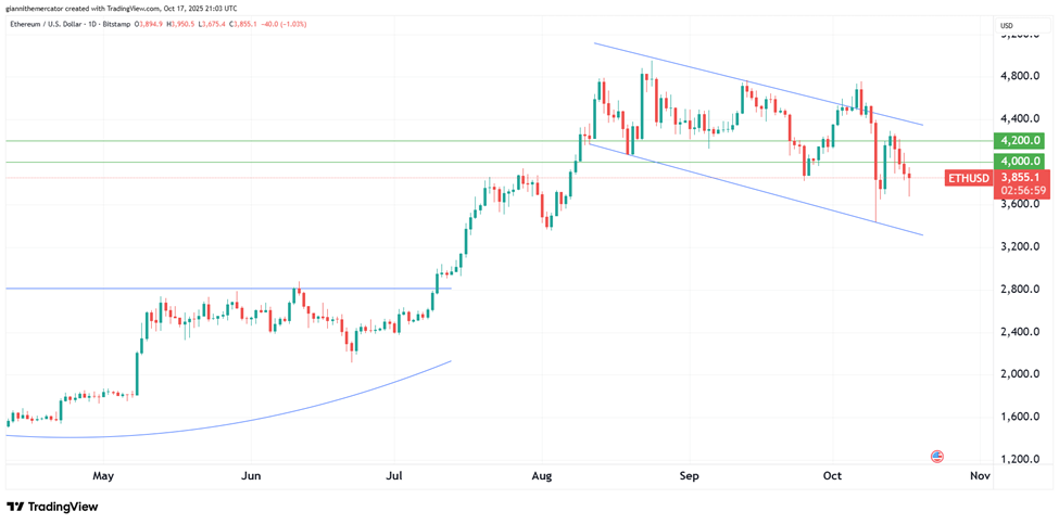 I'm eyeing the descending price channel setup on Ethereum's chart. This is a continuation pattern, and if we see a rally back above the upper trendline of the channel, it would signal that a rally up to 5700-5800 is starting.