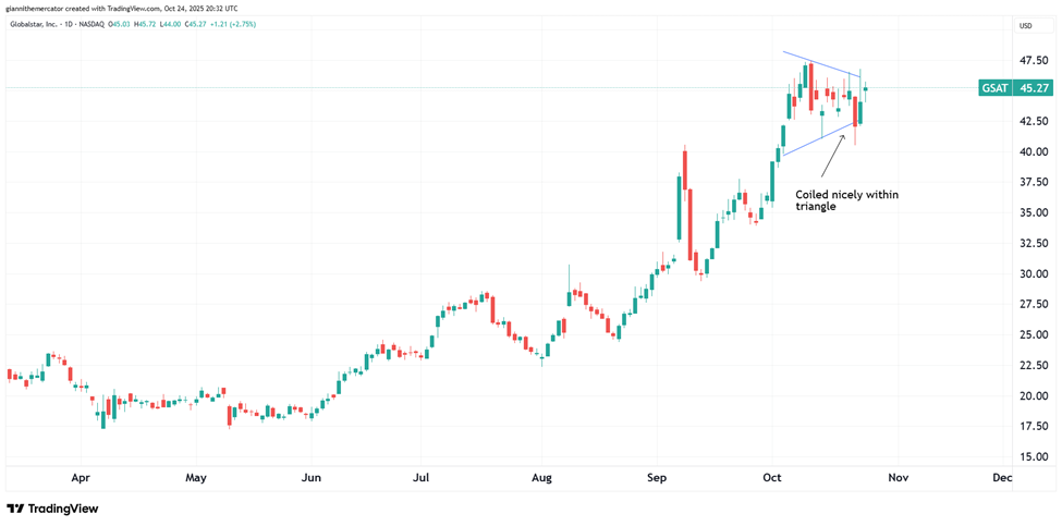 - From a technical perspective, GSAT is coiled up nicely within a triangle formation. This implies that another leg higher in prices is on the horizon.