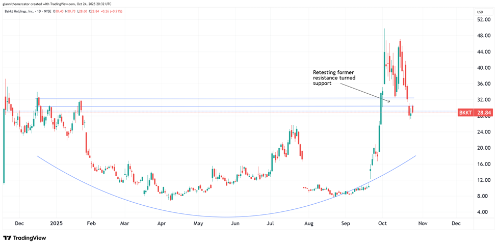 - From a charting point of view, BKKT is retesting former resistance turned support of a saucer formation. If it holds, it's very bullish.