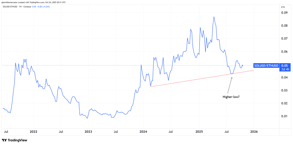 This could be on the verge of changing, however, if we are in the process of completing a higher-low with respect to the trend. If it holds above the trendline, then we could be looking at Solana flipping Ethereum in time.