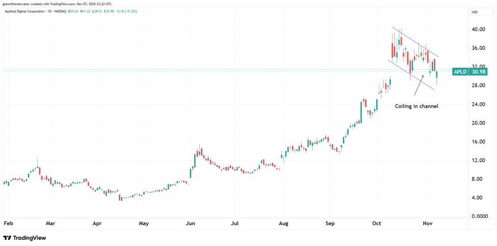 - From a technical point of view, APLD is correcting within a descending channel. If it breaks above the upper trendline of the pattern, look for this to explode to new all-time highs again.