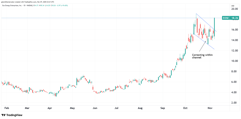 - From a charting perspective, EOSE is breaking out from a channel as it looks to complete another higher-low with respect to the trend.