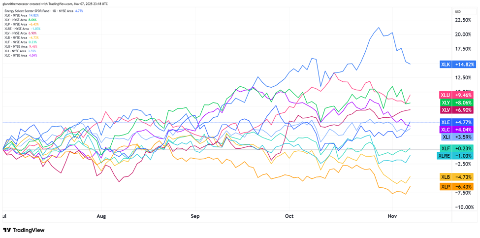 It's been a rather unusual market with respect to flows since the start of the third quarter. There are four of the eleven sectors of the S&P in negative territory since then. The only one that gives me some concern is financials (XLF).