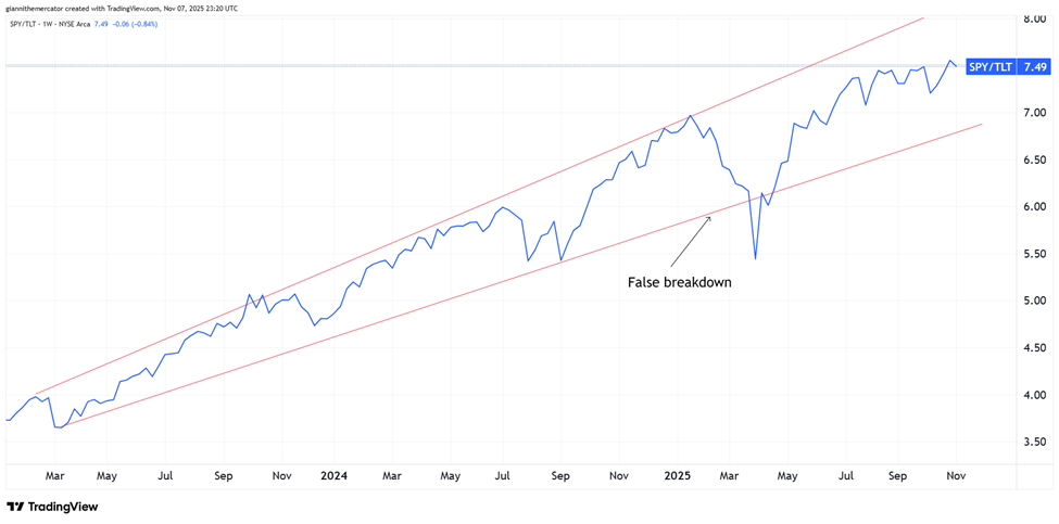 I'm looking at the ratio here between the S&P 500 (SPY) and long-term Treasuries (TLT). This is one of the most classical "risk-on" versus "risk-off" ratios out there. Simply put, when SPY outperforms TLT, it pays to take risks. When TLT outperforms SPY, it's time to be more cautious.