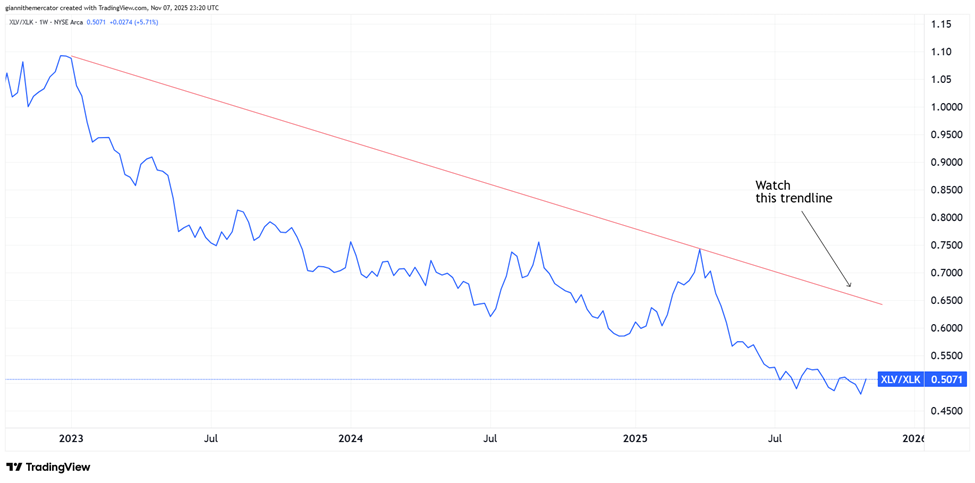 First thing's first – we need to start seeing higher-highs and higher-lows, versus lower-lows and lower-highs in this ratio. Then, I'd like to see the downward sloping trendline broken to the upside. That would be the setup for healthcare to run in 2026.