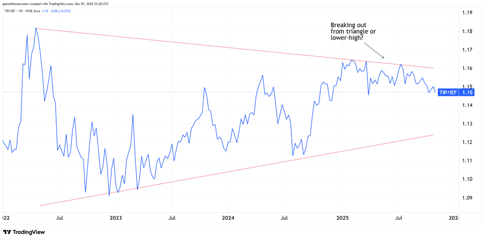 However, there's still room for this ratio to drop and stay consolidating within the pattern. Thus, I'm not expecting inflation to accelerate immediately, but I am looking for it to start accelerating sometime in 2026. This ratio will give us a good clue as to when.
