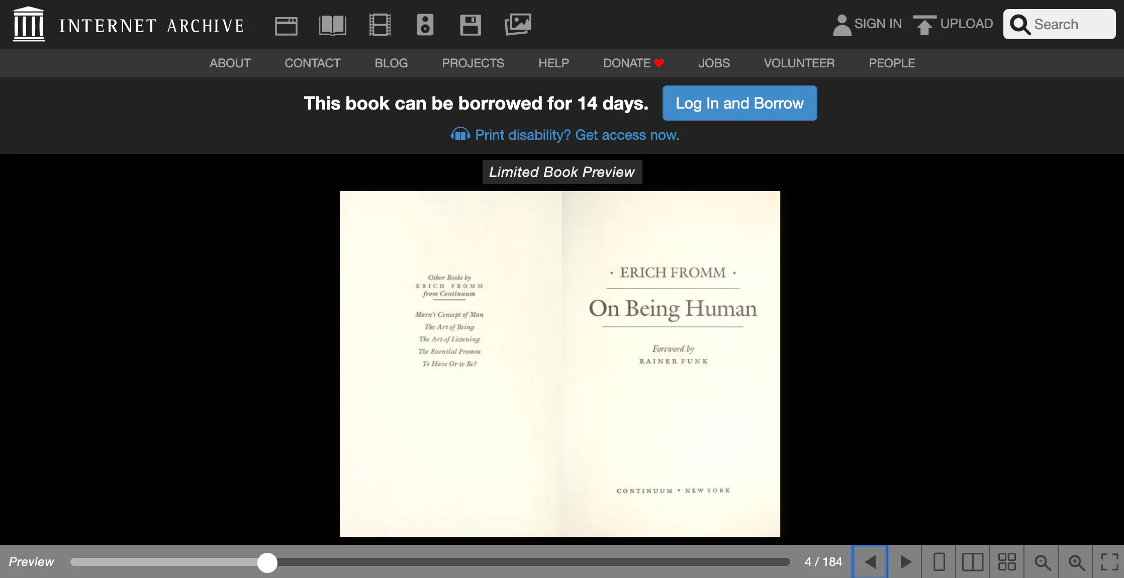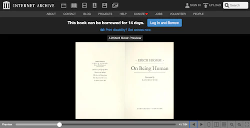 Once you've signed up with the Internet Archive, you can browse its virtual shelves by dropping an author's name, book title, genre of writing, and other details. Here's an example: On Being Human by Erich Fromm.