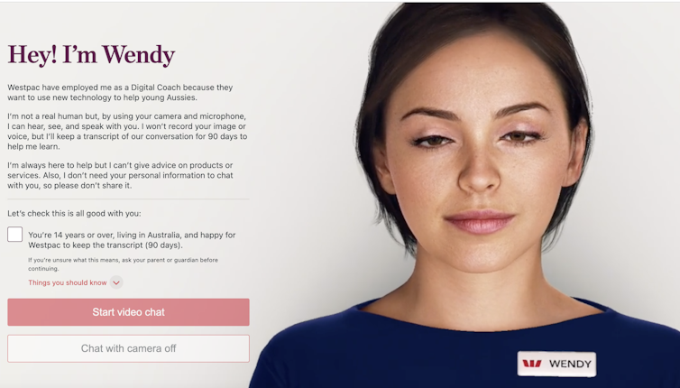 Meanwhile, the 3D-live-action-rendered Westpac Wendy, who says on the bank’s website that “Westpac have employed me as a Digital Coach because they want to use new technology to help young Aussies”, made her online debut a decade after Jess. She seems slightly better, with an improved ability to emote a more believable sense of humour.