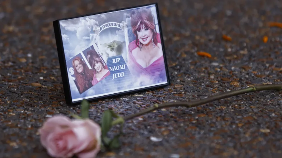 Fans gathered outside the museum, drawn to a white floral bouquet outside the entrance and a small framed photo of Naomi Judd below. A single rose was laid on the ground.