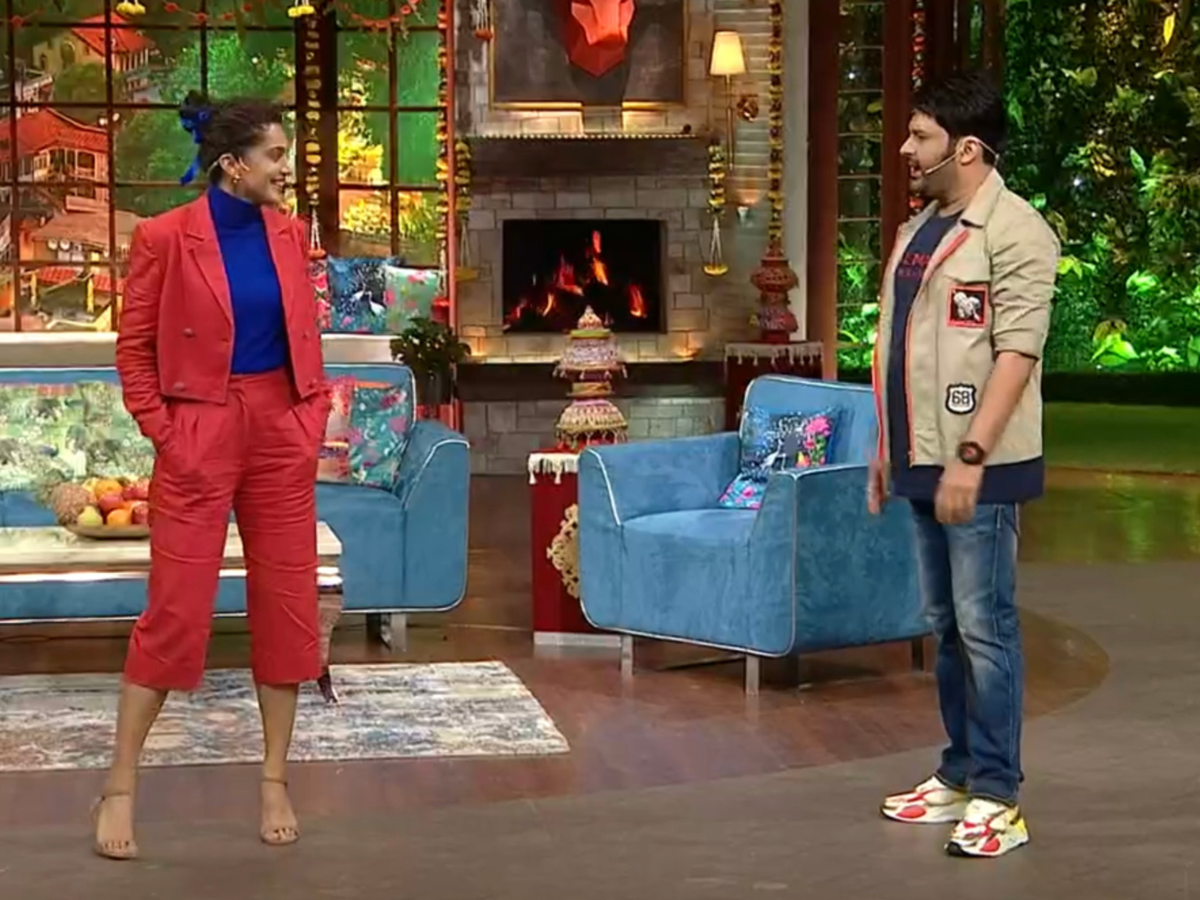 Taapsee Pannu made a grand entry and looked gorgeous as always in a red co-ord set paired with dark blue turtle neck top. Kapil Sharma joked around with her about her theme of films and teased how she might have taken a ‘PT Usha’ course rather than an acting course since she has been playing sports related characters in her films lately. He even pulled her leg and said that the audience might even see her participating the the olympics quite soon. But Taapsee being herself, and had a savage reply ready to that and said that she got into Bollywood by ‘sports quota’.
