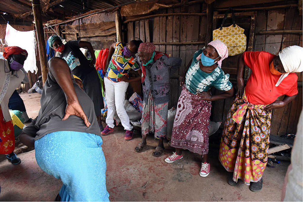 A makeshift punching bag stuffed with rags hangs from the rafters. The women form a circle around it, colourful khangas wrapped tight, bare feet planted firmly on the earthen floor.