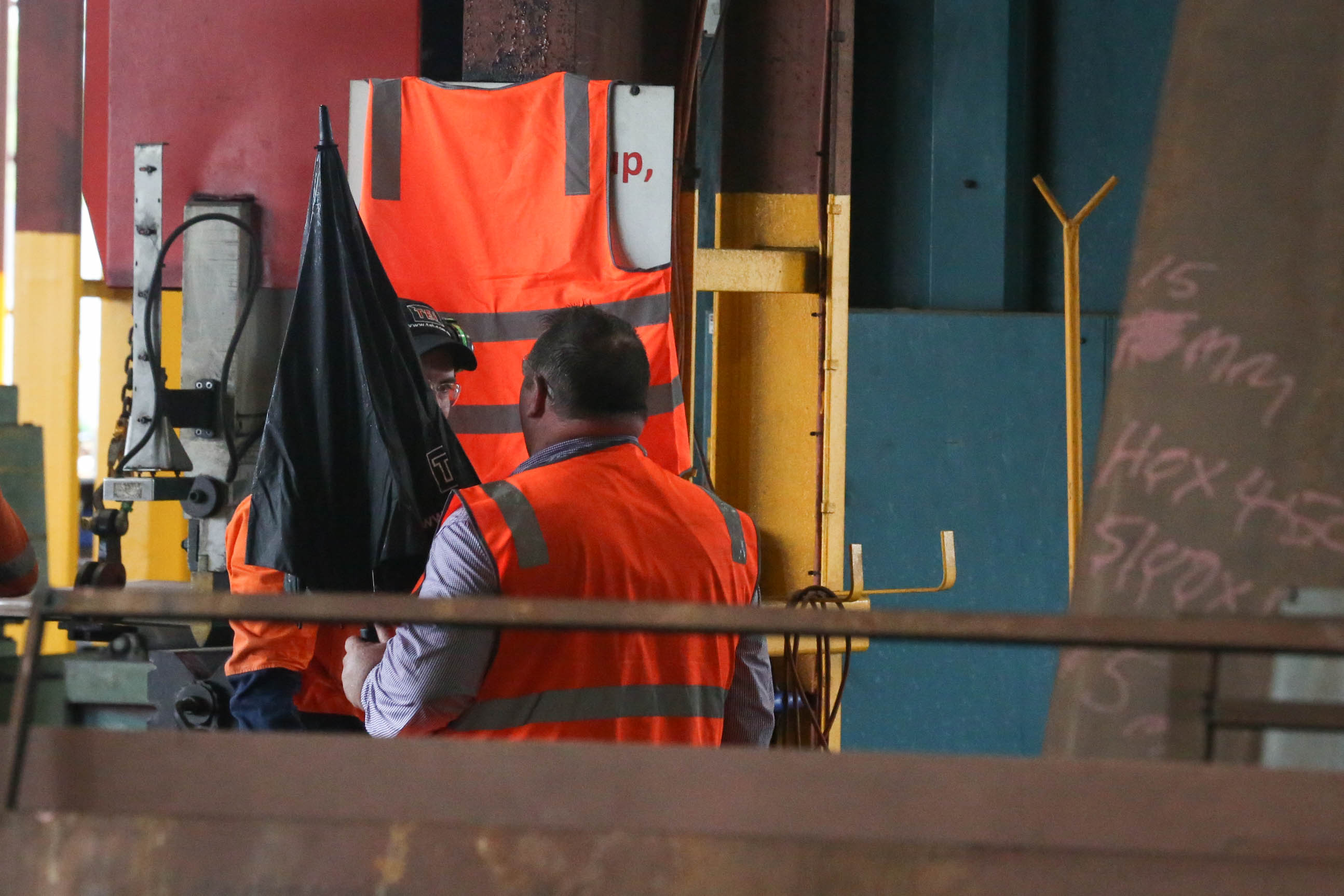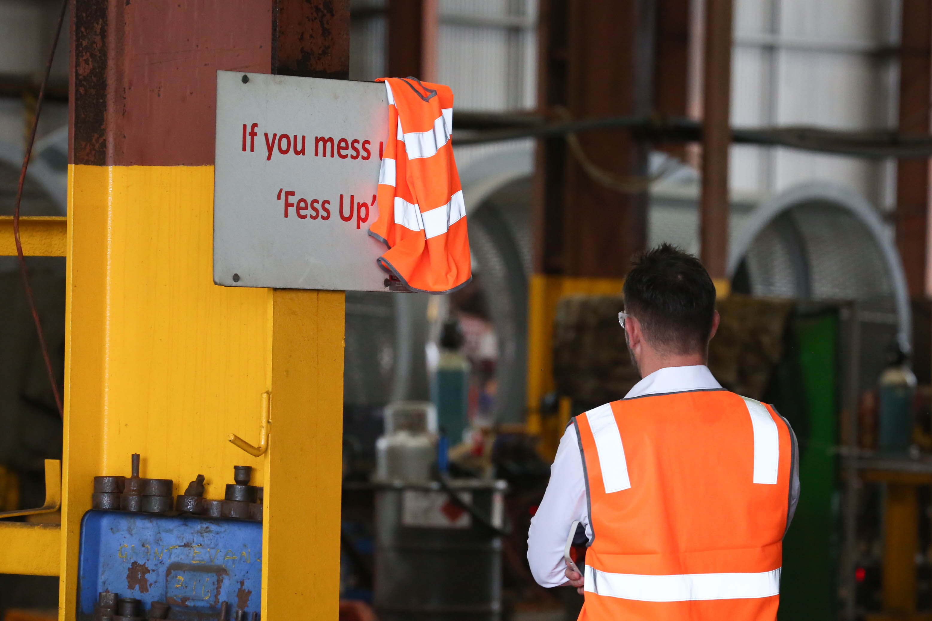Finally, under the watchful eye of the factory boss, a staff member dresses the sign as if it's wearing the vest, hiding the words the adviser doesn't want to be seen.