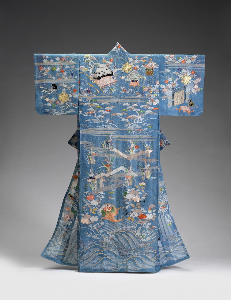 Some of these Edo period kimonos can become quite narrative-driven in their design, as with the Hitoe kosode kimono with themes alluding to eight Noh theatre plays of the late Edo period. Slightly smaller than the wedding kimono, that was 177.5 cm long as opposed to 167 cm, this one revels in a blue background on gauze satin silk with a multiplicity of little narrative scenes like an assembly of diverse stage sets.