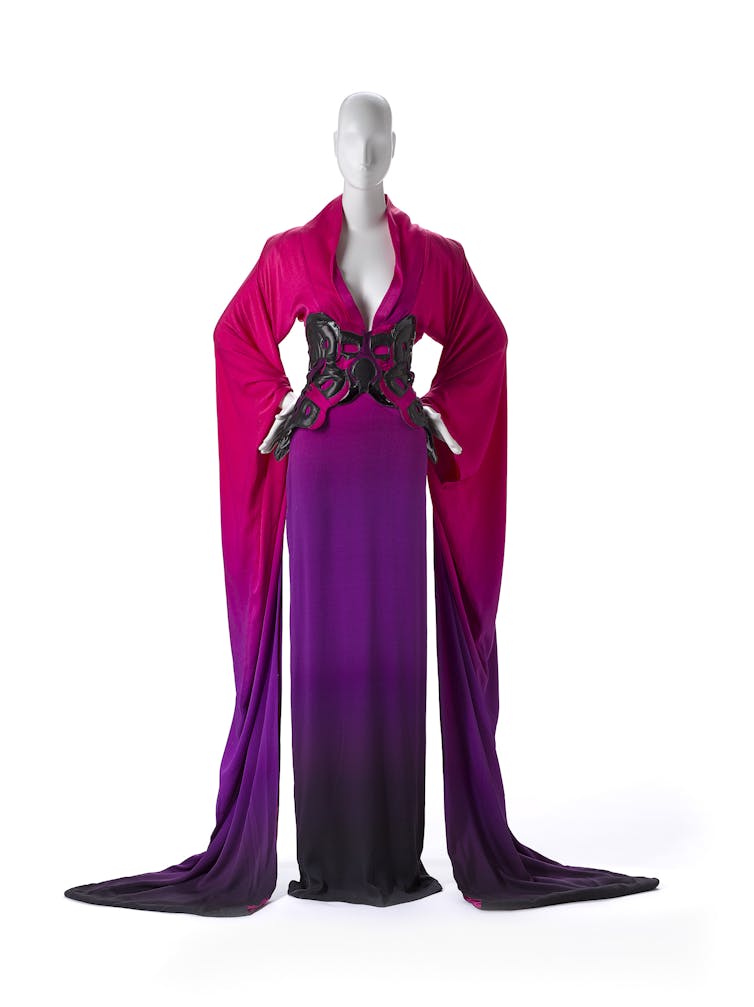 Alexander McQueen’s Gown, belt and sandals (Dégradé) (2007) is one of the takeaway memories from this exhibition. The humble functional kimono has been totally transfigured.