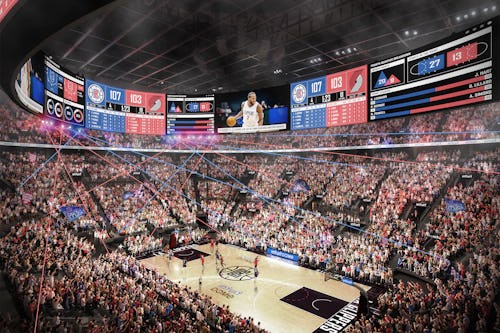 Overall, the Clippers’ priority seems to be on digitizing the fan experience — displays will be “located inside and outside” the arena, with “a giant 23-foot-high by 190-foot-wide screen,” overlooking the outdoor court.