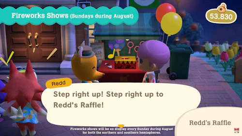You can also spend some bells on tickets to a raffle run by the conniving fox, Redd. His prizes include festival items you can play with during the weekly celebrations.