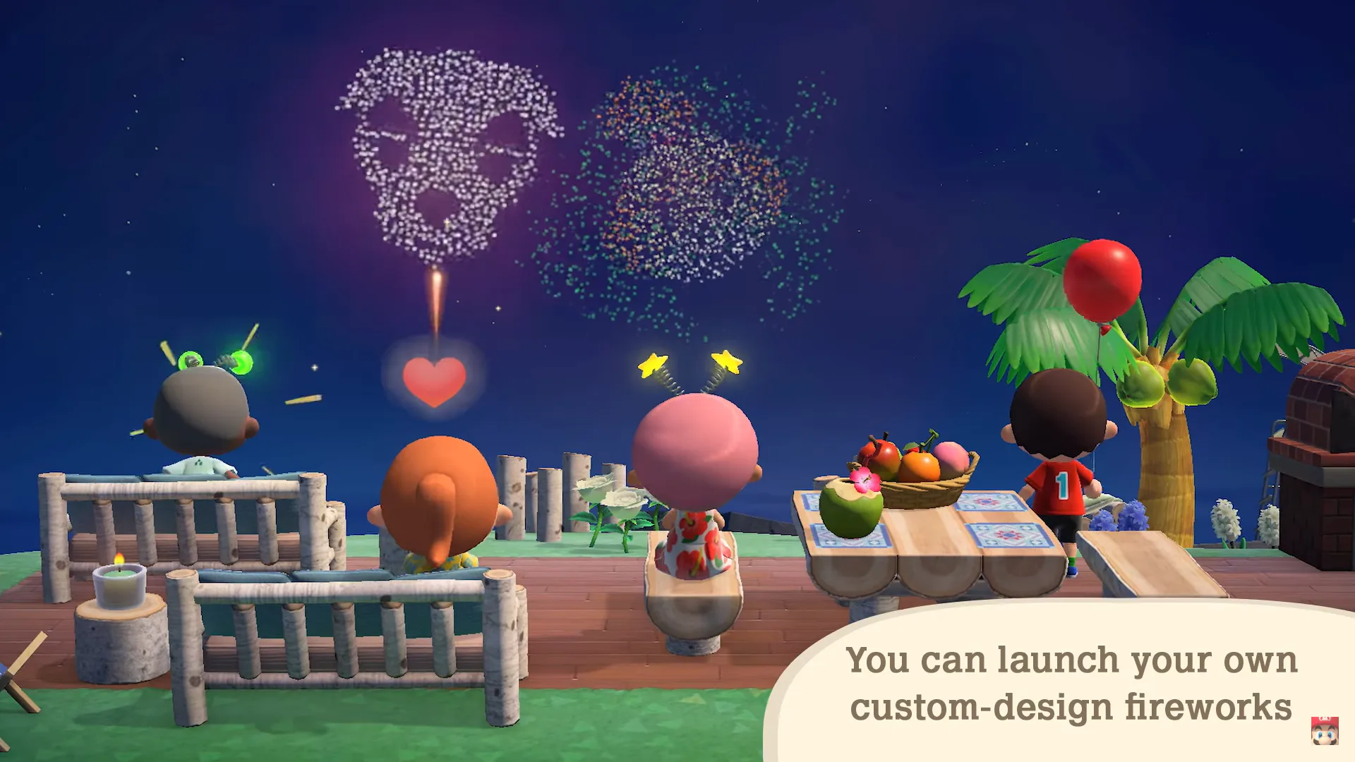 Every Sunday at 7 PM there will be a fireworks display in the plaza for everyone on the island. Race over to catch the bright colors with your villagers or visiting friends.