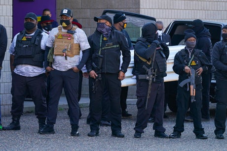 More than a dozen men from a local security group, many with rifles, sidearms and wearing body armor, are watching over the funeral for Daunte Wright, the 20-year-old Black man killed last week in the Minneapolis suburb of Brooklyn Center.